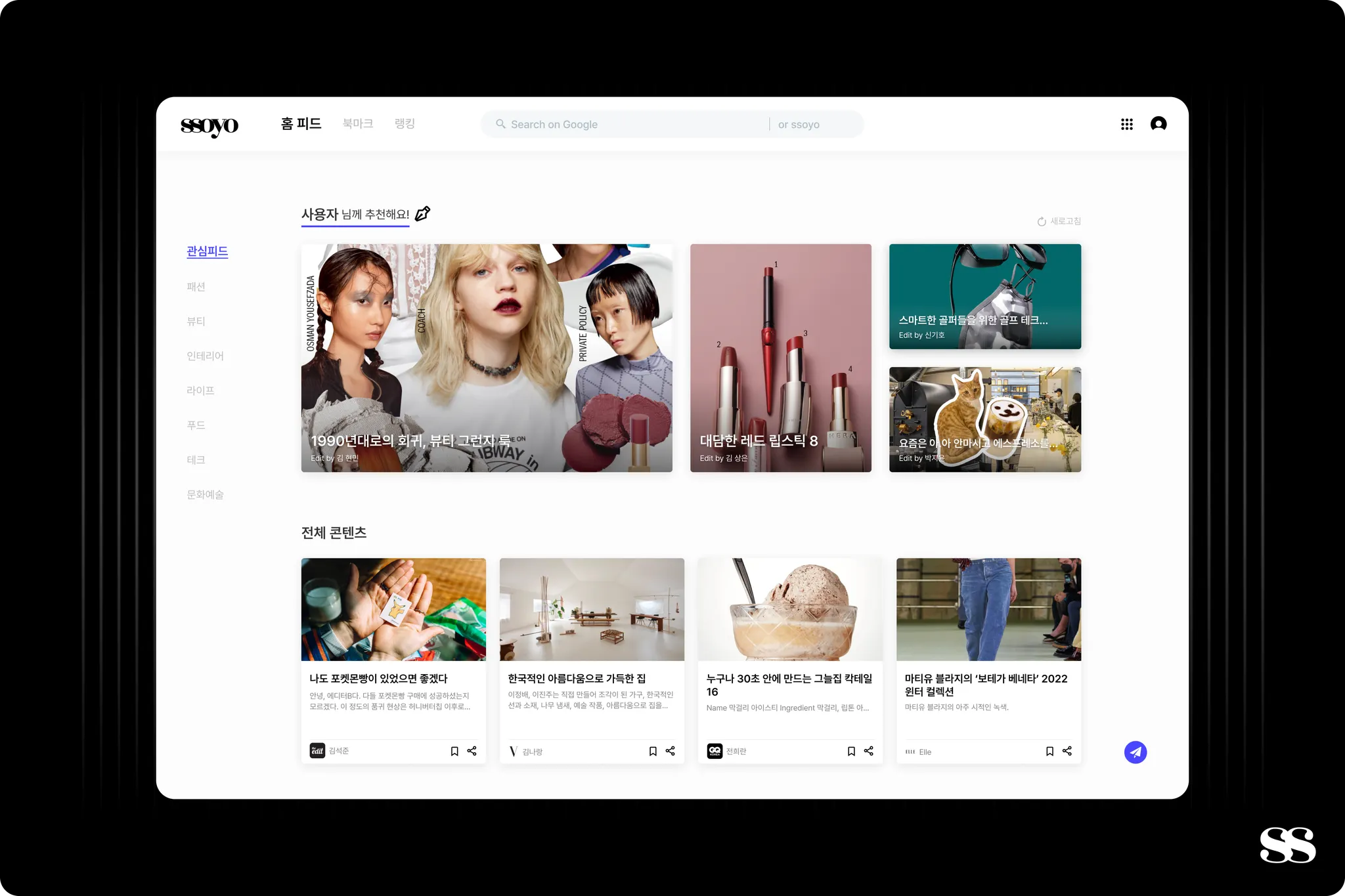 쏘요는 현재 크롬 확장 프로그램 형태로 서비스를 운영하고 있으며 다양한 매거진사와 온라인 편집샵 데이터를 바탕으로 유저 개인의 관심사에 기반한 맞춤형 피드를 제공하고 있습니다.